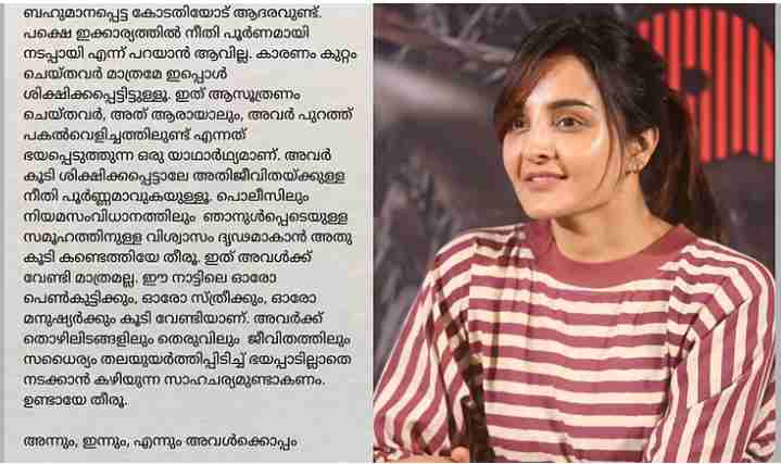ആസൂത്രണം ചെയ്തവർ പകൽ വെളിച്ചത്തിലുണ്ട്; അവർ കൂടി ശിക്ഷിക്കപ്പെട്ടാലേ, അതിജീവിതയ്ക്കുള്ള നീതി പൂർണമാകൂ: മഞ്ജു വാര്യർ